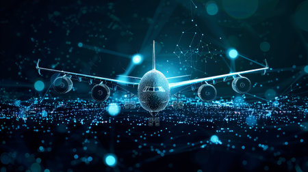 An airplane soars gracefully over a complex network of lines and dots, symbolizing the fusion of technology and travel.