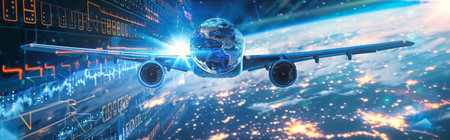 A futuristic airplane flies through a digital sky, with a glowing Earth visible in the distance. The plane is surrounded by abstract digital data and bright lights.