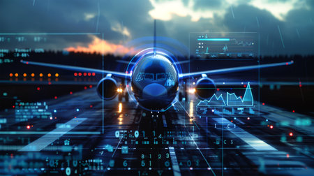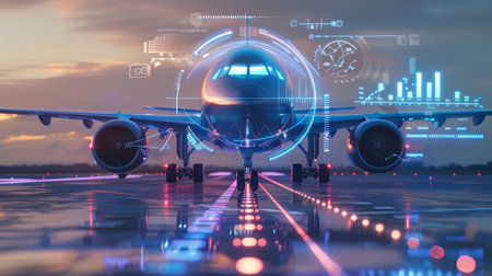 An prepare airplanes for takeoff on the runway, featuring advanced holographic display elements showing flight statistics against a twilight backdrop.