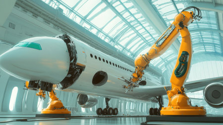 Robotic arms welding aircraft parts in aerospace manufacturing facility. Concept Aerospace Manufacturing, Robotic Technology, Welding Processes, Aircraft Assembly, Industrial Robotics