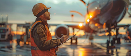 A ground crew man using a clipboard to assess an aircraft