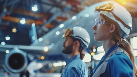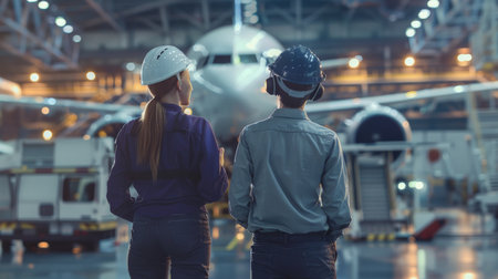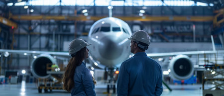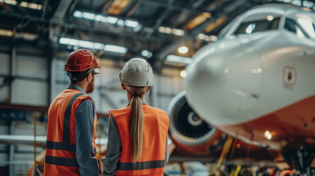 Low angle view of female and male engineers looking at airplane in hangar