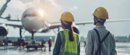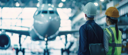 Front view of male and female engineers looking at airplane at airport terminal