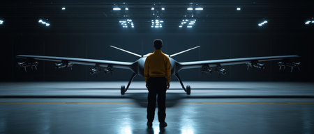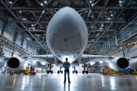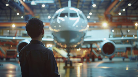 A man stands in front of a large airplane in a hangar. The hangar is lit up, and the airplane is the main focus of the image. The man is admiring the plane