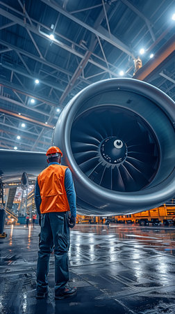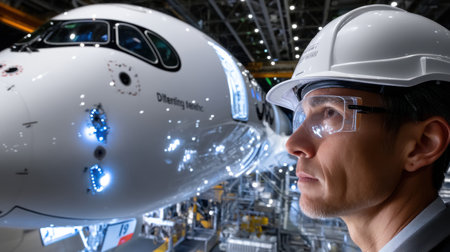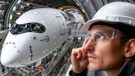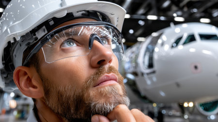 A man wearing a hard hat and safety glasses is looking at a plane. Concept of curiosity and wonder as the man gazes at the aircraft