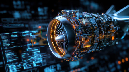 A jet engine with a glowing red tip is shown in a computer screen. Concept of futuristic technology and innovation