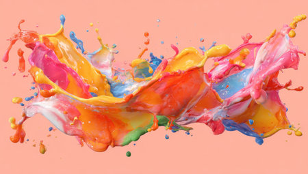 An image showcases dynamically splashing paint in a spectrum of vivid colors against a delicate peach backdrop. The artwork features textured paint effects and a balanced composition. The bright, energetic visual is suitable for use in design projects, advertising campaigns, and creative content.