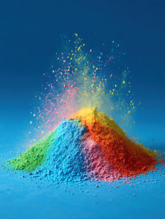 Brightly colored powders in various shades are piled together, with fine particles rising and creating a dynamic burst of color against a blue backdrop.