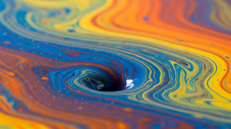 A colorful liquid with swirling patterns of blue, orange, and yellow, featuring a hole in the center. The has a psychedelic and surreal effect, with vibrant colors creating a dreamy and artistic visual expression.