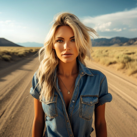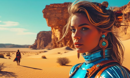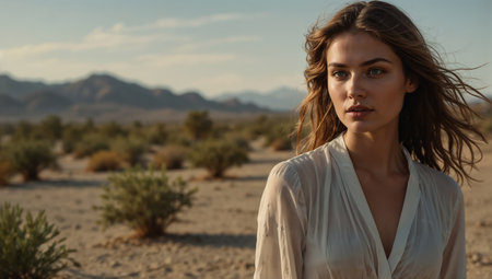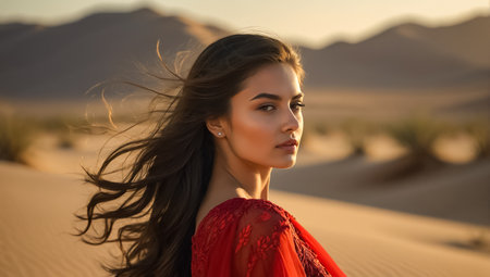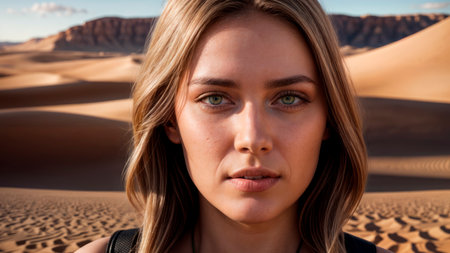 A young woman stands in the middle of a desert, the wind blows her hair. AI-generated.
