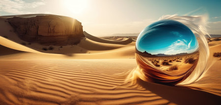 Floating sphere reflecting a desert within a desert. Generative AI