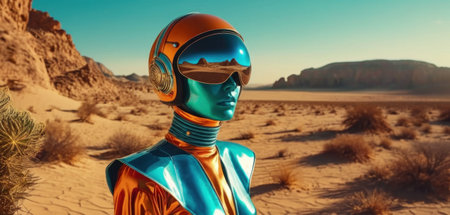 Sexy blonde woman in silver latex costume posing in the desert.