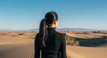 Woman with ponytail stands on a sand dune, looking out at the expansive desert landscape and distant mountains under a clear blue sky. the scene evokes solitude and contemplation.