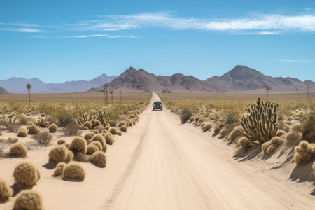 road trip through the desert, with sand dunes and cacti in the background, created with generative ai