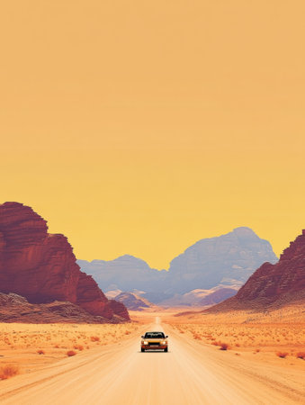 A car cruises on a desert road, surrounded by mountains and bathed in warm orange hues, creating a tranquil atmosphere.