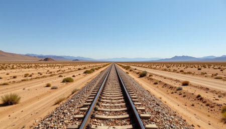 A stunning view of railway tracks leading into a vast desert landscape under an endless blue sky. This image captures the essence of solitude, adventure, and exploration in stark, arid terrain, perfect for travel themes.