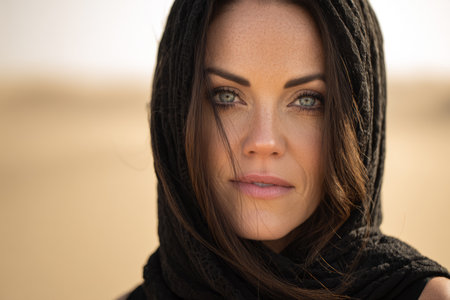 a woman wearing a scarf and standing in a desert