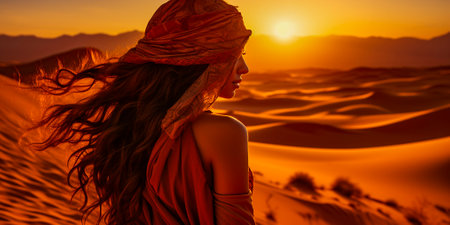 An Arab woman stands gracefully against a stunning desert sunset. Her silhouette is highlighted by the vibrant hues of orange and pink in the sky. In front of her is an expanse of sand dunes.
