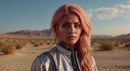 Beautiful young woman with pink hair in the middle of the desert