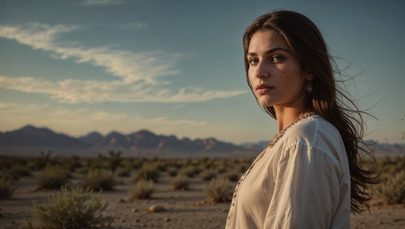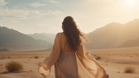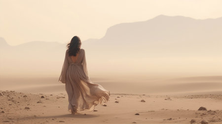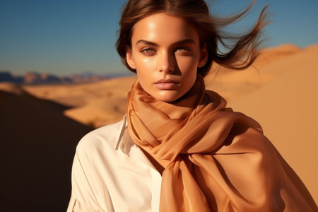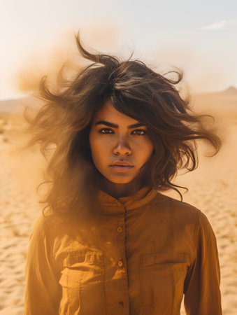 A young woman with a shawl stands in the middle of a desert, the wind blows her hair. AI-generated.