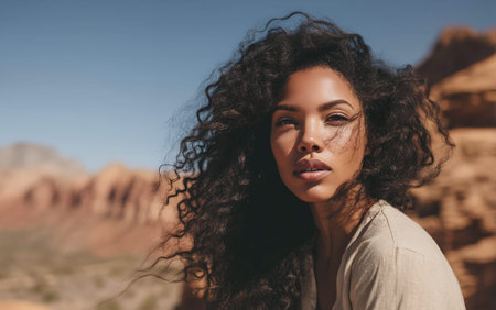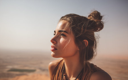 Close-up portrait of a beautiful young woman in the desert.