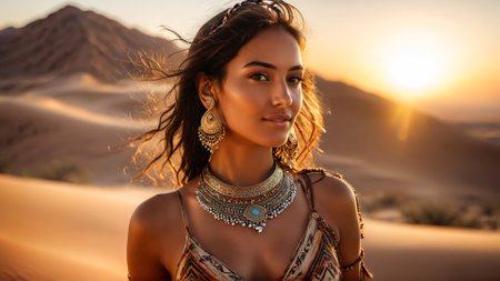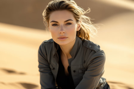 A woman sits gracefully on warm sand dunes, illuminated by golden hour light. Her serene expression reflects confidence and tranquility, capturing the essence of the desert's beauty.