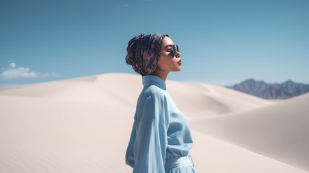 Portrait of a beautiful young woman in turban and sunglasses in the desert.