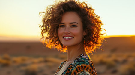 A young woman with curly dark hair stands in front of a desert landscape, her face turned towards the sun.