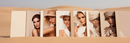 Young girls in beautiful fashionable clothes in calm sandy colors, fashion magazine cover, high fashion, banner