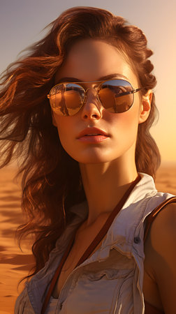Beautiful young woman in the desert at sunset, 3d rendering