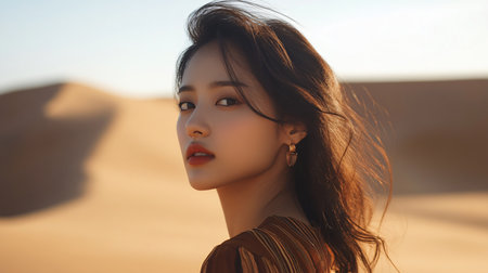 Beautiful Asian woman in the desert with sand dunes.