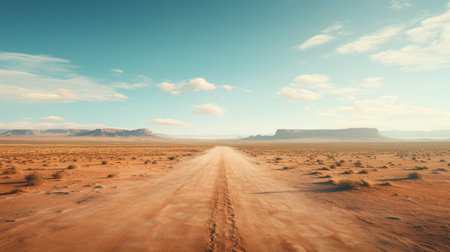 AI Generated. Dusty road stretching toward the horizon under bright sun in a desert landscape