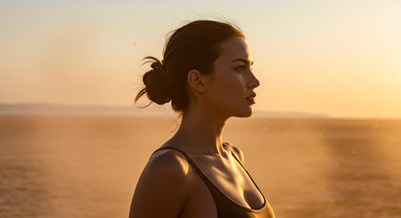 Portrait of a beautiful young woman at sunrise on the beach.