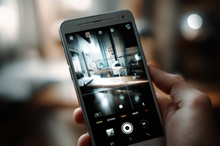A hand holding a smartphone frames a person deep in thought, surrounded by soft light in a charming indoor location, showcasing creativity and focus.