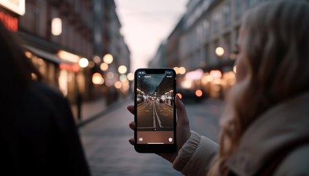 A person taking a picture of a city street at night. Generative AI.