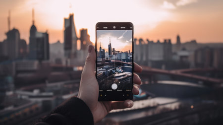 A person taking a picture of a city at sunset. Generative AI image.