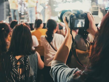 Hands with digital camera taking a picture at stage of music concert