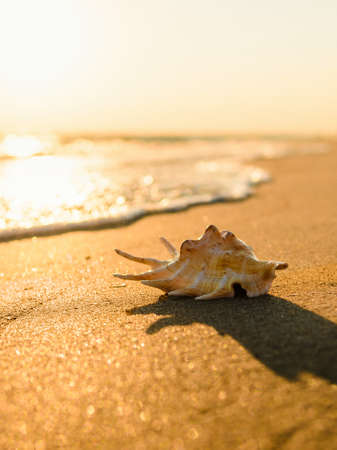 Golden sunset on the seashore. Vertical landscape. Seashell on a sandy beach. Selective focus on the shell.