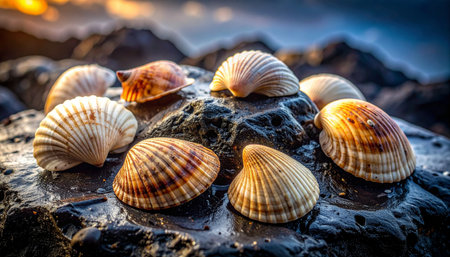 A collection of seashells, treasures left by the receding tide, glisten on dark, wet coastal rocks.