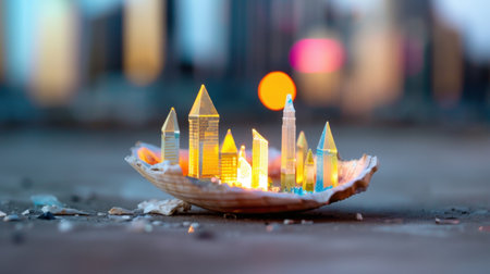 A stunning arrangement of luminous crystals set within a shell, creating a striking contrast against a soft urban bokeh backdrop during twilight.