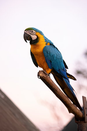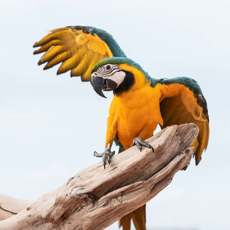 Closeup Blue and Gold Macaw Perched on Branch Isolated on Background with Copy Space