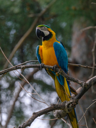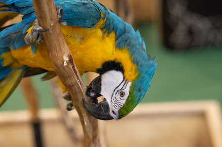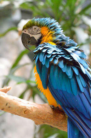Portrait of blue-and-yellow macaw (Ara ararauna) sitting on a branch and brushing. This parrots inhabits forest, woodland and savannah of tropical South America