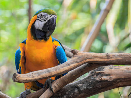 Close up portrait of a blue and yellow Macaw parrot sitting on a wooden perch against a lush green tropical garden. Exotic bird in a zoo looking at the camera. Bird watching.