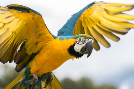 flying beautifully colored parrot ara (Ara ararauna) costa rica.