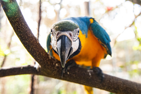 Close up of colorful macaw ara parrot in the jungle forest on a sunny day