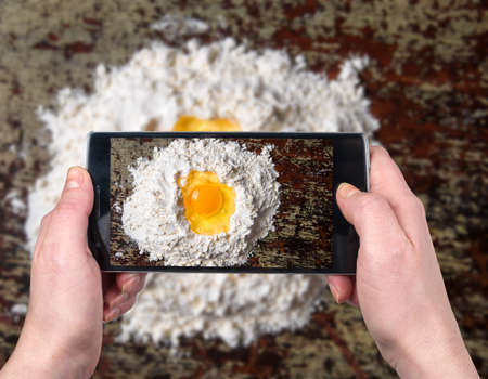 Food and desert photography by smart phone concape. Woman hands make food take photograph with smartphone. For blogging or social media use.