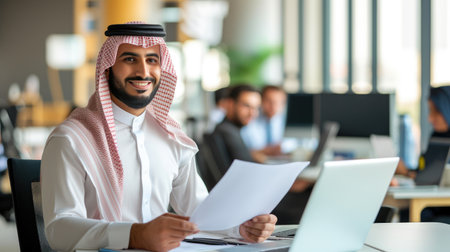 Portrait of Arab man wearing traditional while clothes working at office. --ar 16:9 --v 6 Job ID: 9d19b9f0-1dc1-432e-acff-c87f6cbe7fa5