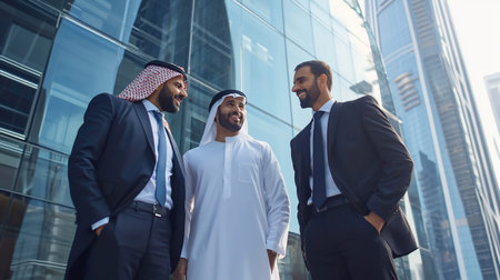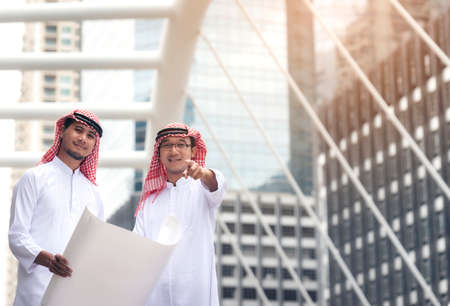 two arabian business men discuss and walk together around modern city