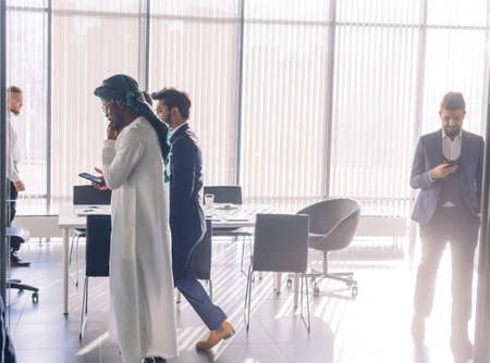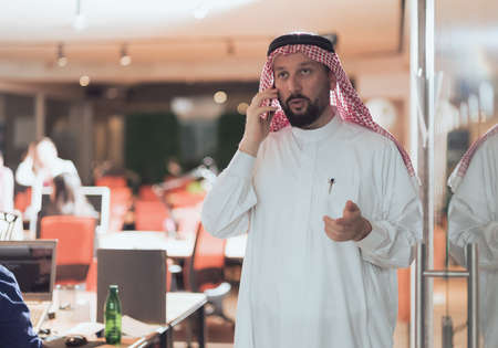 Middle eastern Arab businessman in the office speaking on smartphone in front of his team