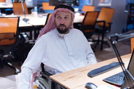 Handicapped Arabic businessman in tradition suit working in office. Disabled businessman in the wheelchair works in the office at the computer.